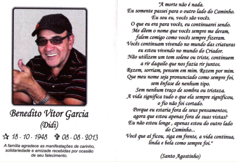 Hoje, revendo o Vale Independente, encontrei a coluna das personalidaes já falecidas. Senti uma emoção muito grande, saudades apertando o peito e uma grande vontade de abraçá-los. Foi iluminada ao colocar o nome de meu pai, de quem orgulho muito, politico, vereador, honesto, amigo sensato e exigente com todos. Ele deixou 9 filhos, cumpriu sua missão de pai e esposo. Era formado em Odontologia, mas com a morte de Vovô Zequinha, abandonou a profissao. Foi cuidar da Fazenda Boa Sorte, cortada pela Fernão Dias, hoje.Sentimos saudades imensa de meus pais. Os filhos sempre foram um orgulho para ele, e ele um exemplo de carater digno e honesto, sendo politico.. Mandarei, se possivel for a foto de minha mae e meus dois irmãos que faleceram. Obrigada Giácomo, você me deu uma grande alegria e um domingo maravilhoso. Amo Familias que se completam. Muita paz e saúde para você.