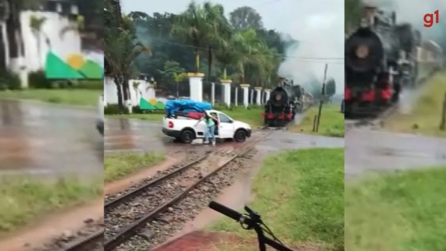 As imagens mostram a caminhonete parando, aparentemente por falha mecânica, com a frente em cima dos trilhos. A gravação mostra a mulher que estava no banco do passageiro do veículo deixando o carro com a aproximação do trem.