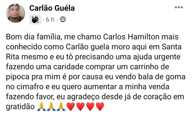 O nosso amigo Carlos Hamilton, mais conhecido como Carlão Guela, está precisando da nossa ajuda urgente para comprar um carrinho de pipoca.