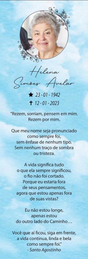 O seu corpo está sendo velado na Funerária Santa Rita, de onde HOJE(17) às 15h00 sairá o féretro para o Cemitério Municipal Luiz Villela Bernardes.
