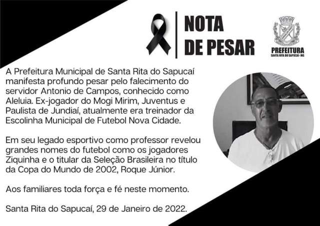 Está sendo velado na Funerária Santa Rita, de onde HOJE(26) às 14h00 sairá o féretro para o cemitério municipal Luiz Villela Bernardes.