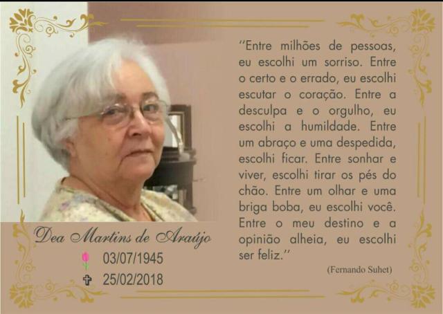 A família enlutada de Dea Martins de Araújo agradece a todos pelo apoio, carinho na ocasião de seu falecimento e convida para a MISSA DE SÉTIMO DIA pelo eterno descanso de sua alma.