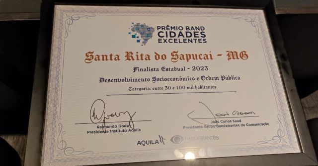 Prêmio Band Cidades Excelentes – Santa Rita do Sapucaí é classificada entre os 44 municípios identificados com boas práticas públicas de MG e o terceiro finalista no quesito Desenvolvimento Socioeconômico