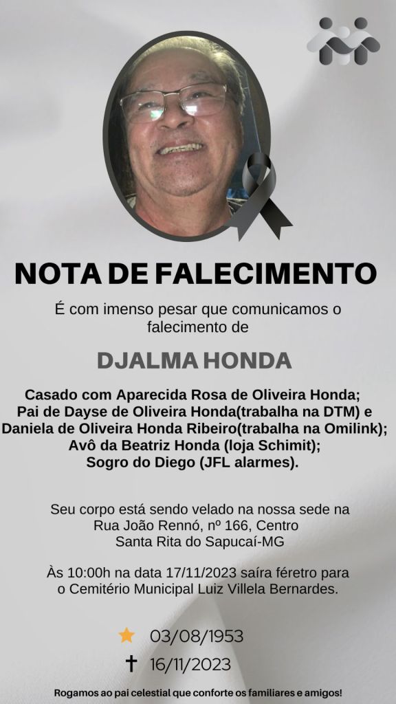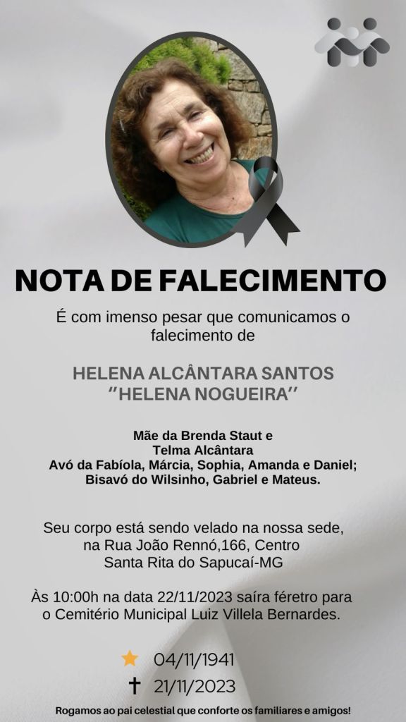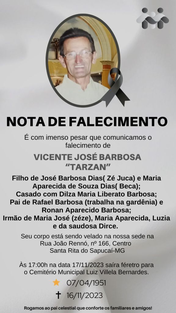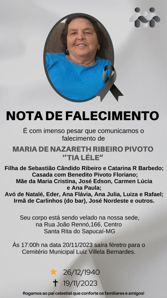 Seu corpo está sendo velado na Funerária Grupo PAF de onde AMANHÃ(13) às 10h00 sairá o féretro para o Cemitério Municipal Luiz Villela Bernardes.