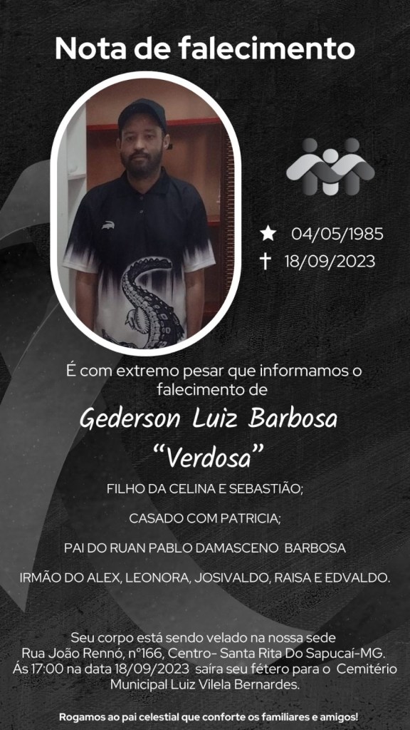 Seu corpo está sendo velado na Funerária Grupo PAF, de onde hoje(13) às 13h00 sairá o féretro para o Cemitério Municipal Luiz Villela Bernardes.